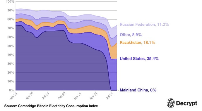 In the years 2019-2020, China was the undisputed leader in bitcoin mining with between 75% and 100% of the “hashrate” coming from China (the “hashrate” is a measure of the computational power per second used when mining. But in May 2021, the Chinese authorities suddenly decided to ban mining on their territory. The blockchain’s decentralized and borderless nature has led miners to move to other countries in the space of a just a few weeks without harming the Bitcoin network. Preferred destinations: The United States, Canada, Russia and ... Kazakhstan. Borat’s country went from 9% to 18% of the global market share in a few months, putting it in the second place for countries hosting the most crypto-currency miners (the 1st place is currently held by the United States).