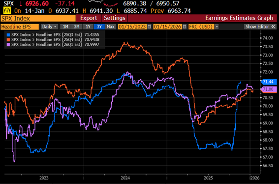 The fourth quarter 2025 earnings season has officially commenced with the major US banks, providing a first look at what is expected to be a period of robust and more evenly distributed growth. For the quarter in aggregate, S&P 500 companies are projected to grow earnings by 9% year over year. While this is strong, European equities are finally showing signs of life with 5% growth, and Emerging Markets have emerged as the standout performer with a 21% increase. This surge in Emerging Markets is primarily driven by the Asian AI supply chain, which is seeing immense demand for hardware components.
