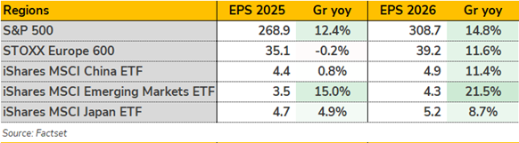 Over the past few months, earnings revisions for 2026 earnings have been mostly positive, particularly in Japan and Emerging Markets: