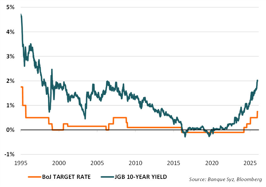 Japanese government bond yields recorded the largest increase among major markets. Rising short-term rates, persistent inflationary pressures, supportive fiscal policy, and concerns over public debt dynamics pushed the 10-year JGB yield up by 90bp, above 2% for the first time since 1999.