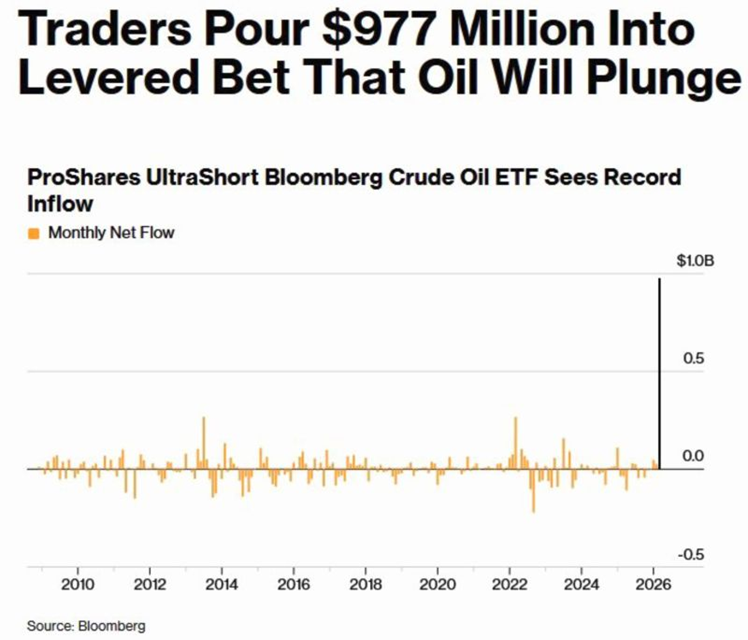 Investors placed a record leveraged short bet against oil, just before geopolitical tensions sent prices soaring. In March, $977 million flowed into the inverse oil ETF (SCO), aiming to profit from falling crude prices. Instead, the funds plunged 41% as oil climbed, only briefly rising after signals of de-escalation.