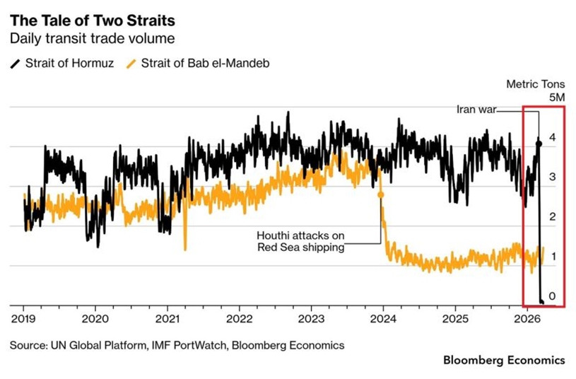 Two critical shipping chokepoints, the Strait of Hormuz and the Bab el-Mandeb are simultaneously under threat, creating serious risks for global trade and energy flows. Oil transit through the Strait of Hormuz has nearly come to a halt since the Iran conflict began, while the Bab el-Mandeb, a key Red Sea route responsible for roughly 12% of global trade, remains unstable due to ongoing Houthi threats. Saudi oil exports via the Red Sea are particularly vulnerable to potential attacks, and the Houthis’ increasing involvement in the Iran conflict further raises the risk of renewed shipping disruptions. Any escalation affecting Iranian oil infrastructure could exacerbate the situation, potentially causing widespread disruptions in global energy and trade networks.