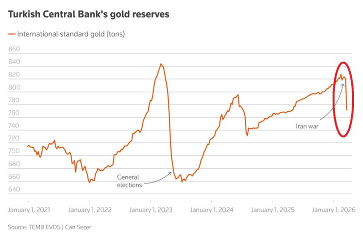 Additionally, a roughly 10% drop in gold prices last week caused an extra $8 billion loss in reserve value, bringing the total weekly decline to $18 billion. Turkey is burning through reserves at a historic rate.