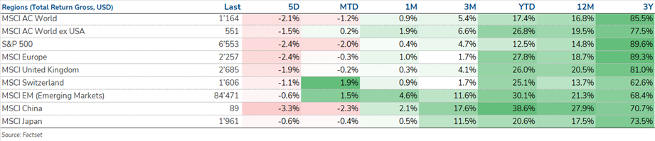 Global equity markets were under pressure last week, with the MSCI AC World Index down 2.1% in USD. The S&P 500 and the STOXX 600 both finished the week down 2.4% in USD as the euro weakened. In the US, the “Mag 7” declined 2.5%, with Apple the weakest performer, falling almost 5% over the week. Smaller-cap stocks underperformed, with the Russell 2000 down 3.3%, and the energy sector was the weakest, finishing the week down 4.2%. China fell 3.3%, with Chinese technology stocks under heavy pressure, while Japan gained 2.7% in local currency and declined only 0.6% in USD making it an outperformer.