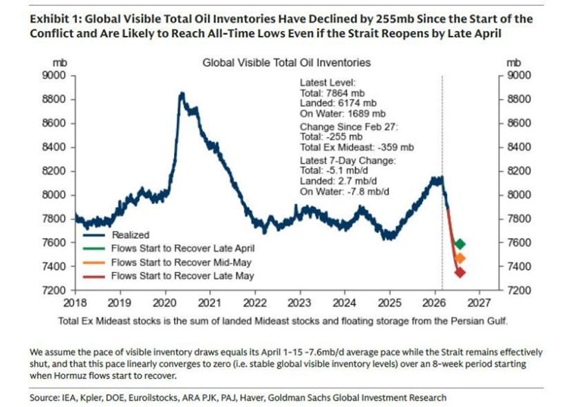 Since hostilities broke out on 27 February, visible global oil inventories have shed 255 million barrels, bringing the total to 7,864 million barrels. The pace of depletion has accelerated sharply: April recorded the heaviest monthly draws since 2017, at nearly 11 million barrels per day, pushing cumulative losses since the war began to 474 million barrels. Flows through the Strait of Hormuz remain at roughly a tenth of normal levels. Even under optimistic scenarios that assume a partial Hormuz recovery by late April, Goldman Sachs analysts warn that all-time low inventory levels may prove unavoidable.