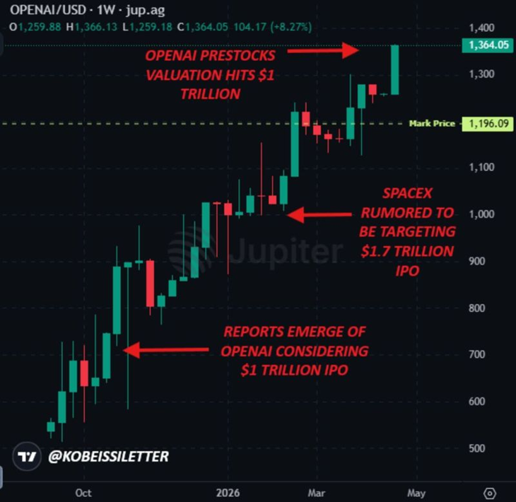 OpenAI has crossed a valuation milestone that would have seemed fantastical just a year ago: pre-IPO instruments now imply a market value of $1 trillion, up 163% since October 2025. The company is not alone at that altitude, Anthropic is reportedly approaching a similar figure ahead of a potential public offering, while SpaceX is said to be targeting a valuation north of $1.7 trillion. The world has never seen so many private companies simultaneously occupying territory once reserved for only the most established public giants.