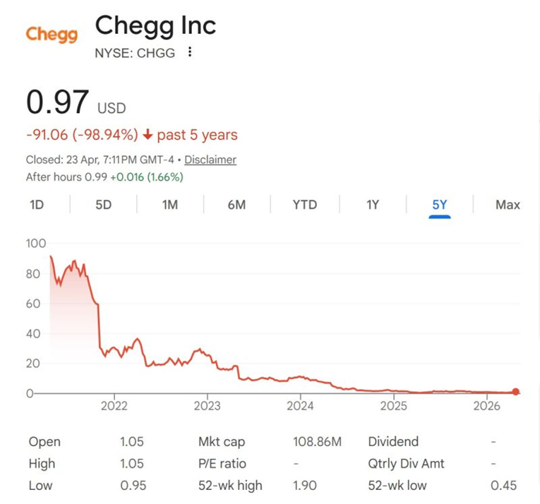 Chegg built a profitable business helping students with homework and textbook rentals. Today its share price has collapsed by nearly 99%, hovering below $1 with market capitalisation of around $100 million, a fraction of where it stood at its 2022 peak. The cause is straightforward: tools like ChatGPT did not simply compete with Chegg's offering; they rendered it redundant. When students can obtain instant, high-quality answers at little or no cost, a subscription-based homework platform struggles to justify its existence. Chegg's fate is being watched closely as a preview of what AI disruption can do to a business with speed and finality, and the broader question it raises is which category faces a similar reckoning next.