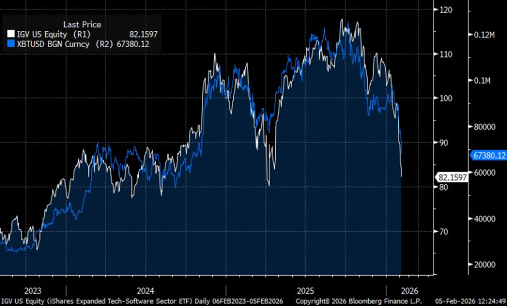 Software equities remain primarily influenced by earnings expectations, valuation sensitivity to rates, and shifts in investor views on AI adoption, productivity gains, and long-term growth potential. Bitcoin is driven by liquidity conditions, positioning, macro risk sentiment and long-term adoption narratives.