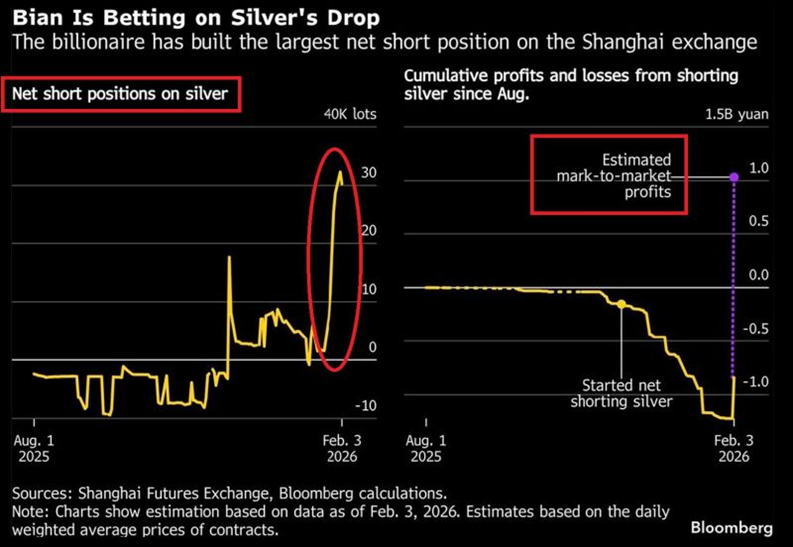 Following the sharp decline in silver prices, this position has generated approximately $300 million in unrealised gains. Even after accounting for losses on earlier trades, some of which had to be closed out the trader is still expected to earn a net profit of around 1 billion yuan, or roughly $144 million.