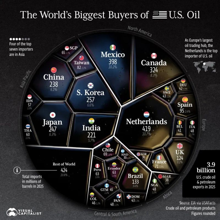 The United States has become a major global energy exporter, with crude oil and petroleum exports reaching 3.9 billion barrels in 2025. The Netherlands is the largest buyer, importing 419 million barrels and serving as a key distribution hub for Europe. In Asia, South Korea, Japan, China, and India together account for nearly a quarter of US exports. Meanwhile, Mexico and Canada remain key partners, representing a significant share of total volumes. US oil now flows to virtually every region of the world, highlighting its central role in global energy markets.