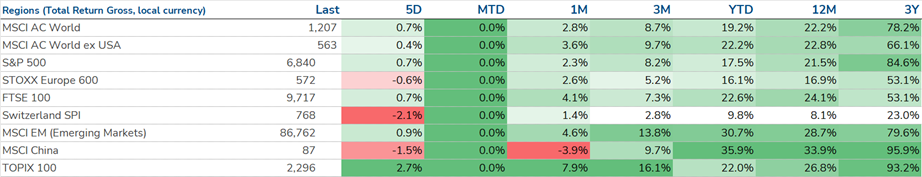 Equity markets ended October on a cautious note, as investors digested a heavy flow of earnings and Fed Chair Powell said a December Fed cut is not a done deal. The S&P 500 gained modestly (+0.7%), though breadth narrowed sharply as mega-cap tech once again dominated leadership (the Mag-7 index up +3.2%). The MSCI World Index rose +0.5% (in USD), with China down -1.5% despite a trade truce with the US, but Korea up +6.9% and Japan up +1.9%.