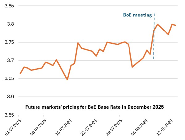 Last week was also eventful for monetary policy in the United States even without a Fed meeting. Trump nominated Miran, a Fed reform advocate and current Chair of the Council of Economic Advisers, to temporarily fill Governor Kugler’s vacant seat through January, potentially paving the way for a broader reshaping of the Fed. Trump advisers are said to currently favour Fed Governor Waller—who recently dissented in favour of a rate cut—as a possible replacement for Chair Powell, signaling a potential shift toward a more dovish FOMC leadership.