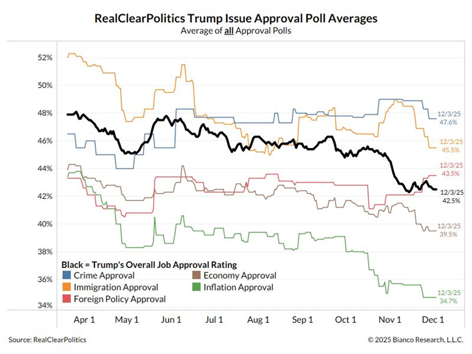 The chart below—courtesy of Jim Bianco—shows Trump's overall approval rating (black) and his approval rating on various issues. The green line is his approval rating on inflation. It's at the lowest of his presidency, and far lower than everything else, even the economy (brown). Inflation is the biggest issue according to polls. So how is cutting rates and pumping up the stock market going to fix this?