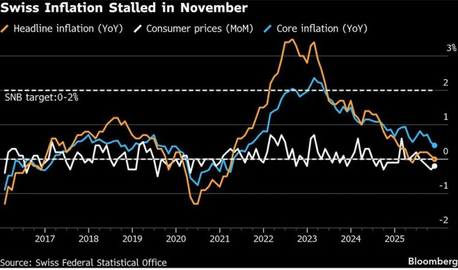 Swiss inflation flatlined in November. Just days before the SNB’s final rate decision of 2025, Switzerland delivered a surprise: consumer prices were unchanged year-on-year. That’s zero inflation.