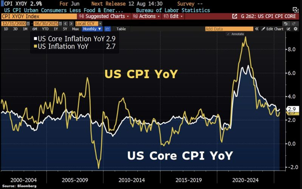 Breaking down the CPI components, there are signs that tariffs are starting to push up prices for core goods such as clothing, furniture, appliances, shoes, and toys. That said, declining car prices are helping to offset the full impact.