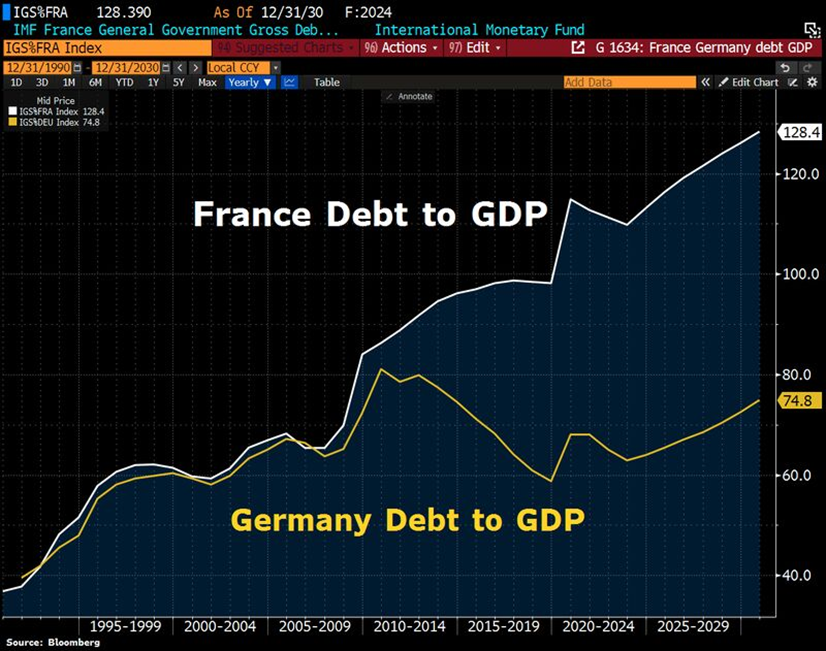 👉 Unlike Germany, which has a low debt-to-GDP ratio, France’s debt level is among the highest in the Eurozone. There is no room for additional fiscal spending, which is why François Bayrou has presented an austerity plan. The challenge, however, is that opposition factions are expected to push back against welfare cuts and spending freezes.