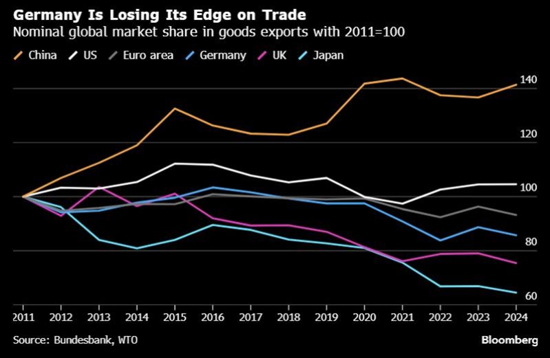 Germany’s share of global trade has been declining since 2017, with losses accelerating after 2021, according to the Bundesbank. More than three-quarters of the decline between 2021 and 2023 is attributed to a drop in competitiveness, rather than trade barriers like tariffs imposed during the Trump administration.