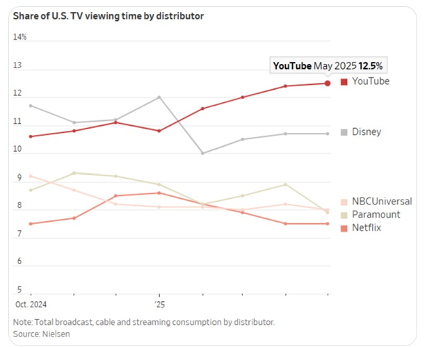 It now accounts for 12.5% of all television viewing in the United States, surpassing every other distributor. With over 1 billion hours watched daily, YouTube outpaces Disney across broadcast, cable, and streaming platforms. No studios, no soundstages, no scripts— just complete dominance of the living room screen.