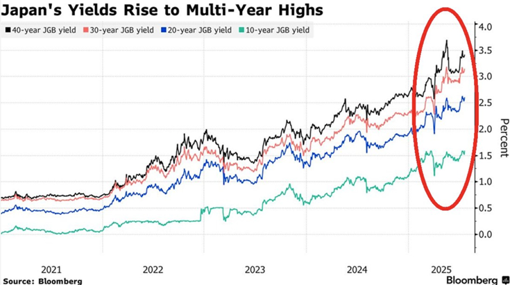 Japan’s 10-year bond yields have surged to their highest level since 2008, driven by mounting fiscal concerns. The increase followed President Trump’s announcement of a trade deal with Japan. It seems that Japan may be absorbing part of the cost of US car tariffs by deploying its own investment funds, effectively providing a partial bailout to facilitate the agreement.