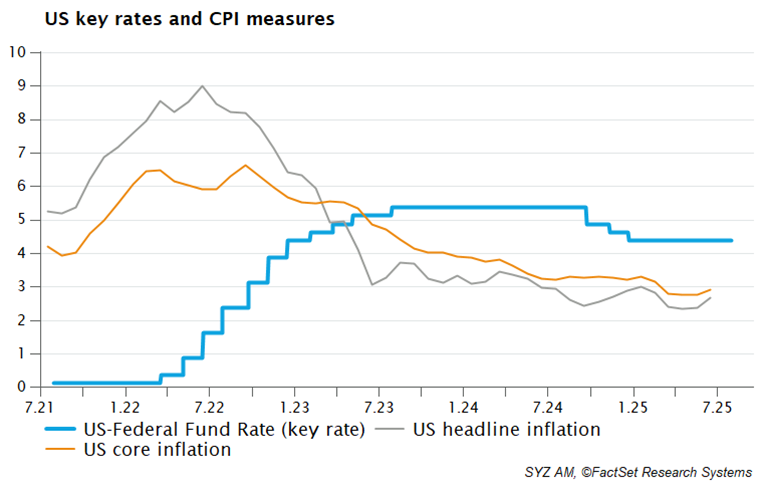 Despite the non-unanimous vote with the two dissenters, the FOMC’s written statement emphasised that the majority of the members deem the current policy stance as appropriate. The text states that “The unemployment rate remains low, and labour market conditions remain solid. Inflation remains somewhat elevated.” There were also two notable changes in the statement—the part regarding the uncertainty about the economic outlook has diminished—was removed. It reads now “uncertainty ... remains elevated”. Also, the text states now that “... growth of economic activity moderated in the first half of the year”, reflecting the latest GDP release for Q2.