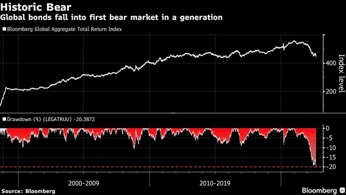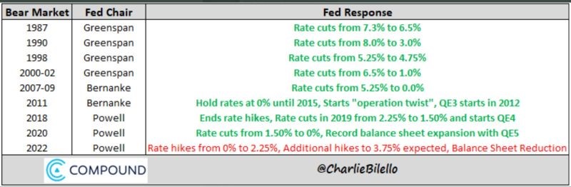 It is very rare to experience periods of monetary policy tightening when stock markets are falling. In the previous eight bear markets, the Fed's bias was decidedly expansionary (rate cuts, QE, etc.). This is not the case with the current bear market. The last historical equivalent (bear market with rate hikes) was in the early 1980s under Volcker.)