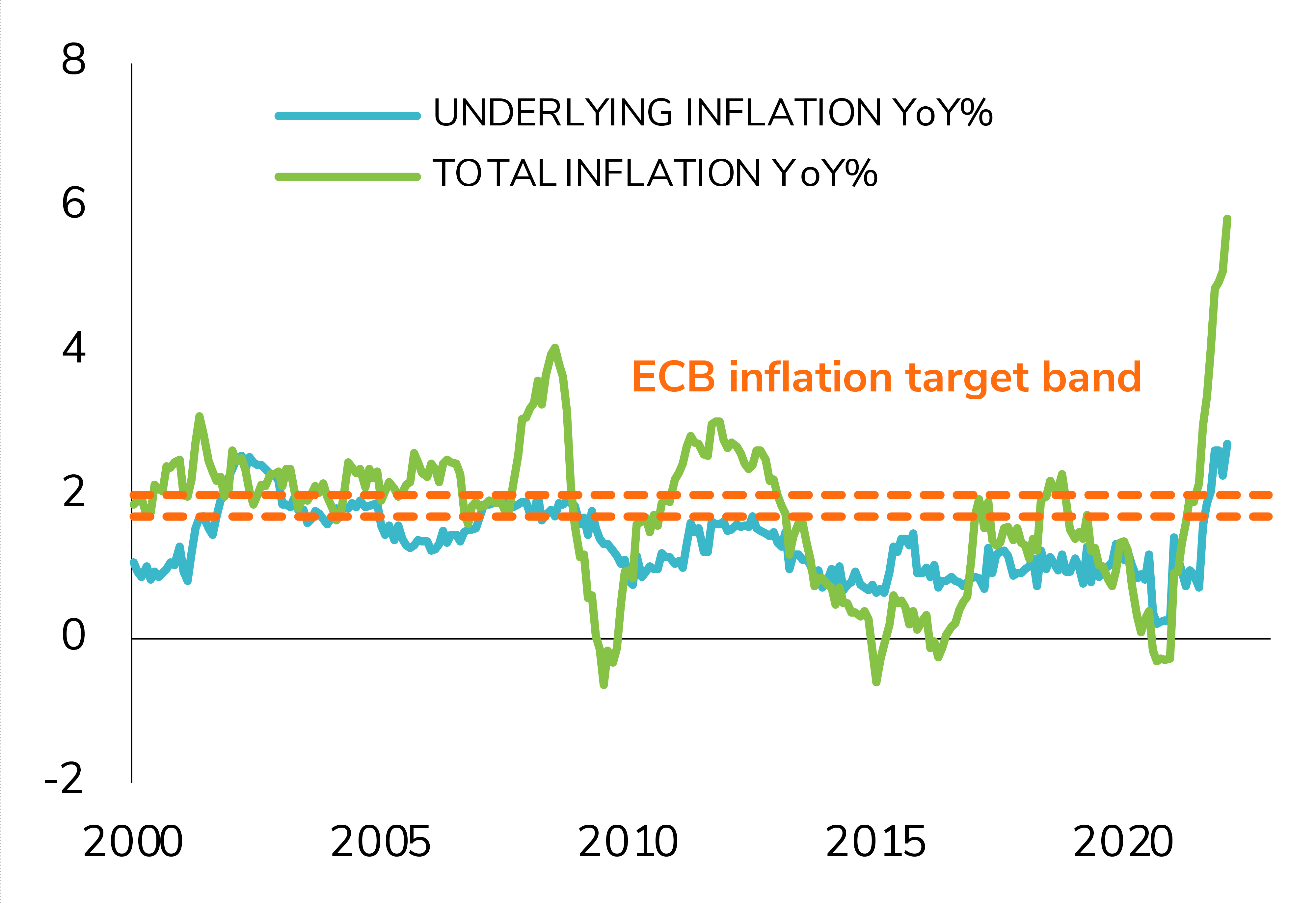 Inflation has been trending up in Europe due to higher energy prices, but also due to strong underlying demand. The “energy” component of inflation is obviously very sensitive to the developments in Ukraine and the ensuing sanctions against Russia, and will likely remain elevated in the months ahead.