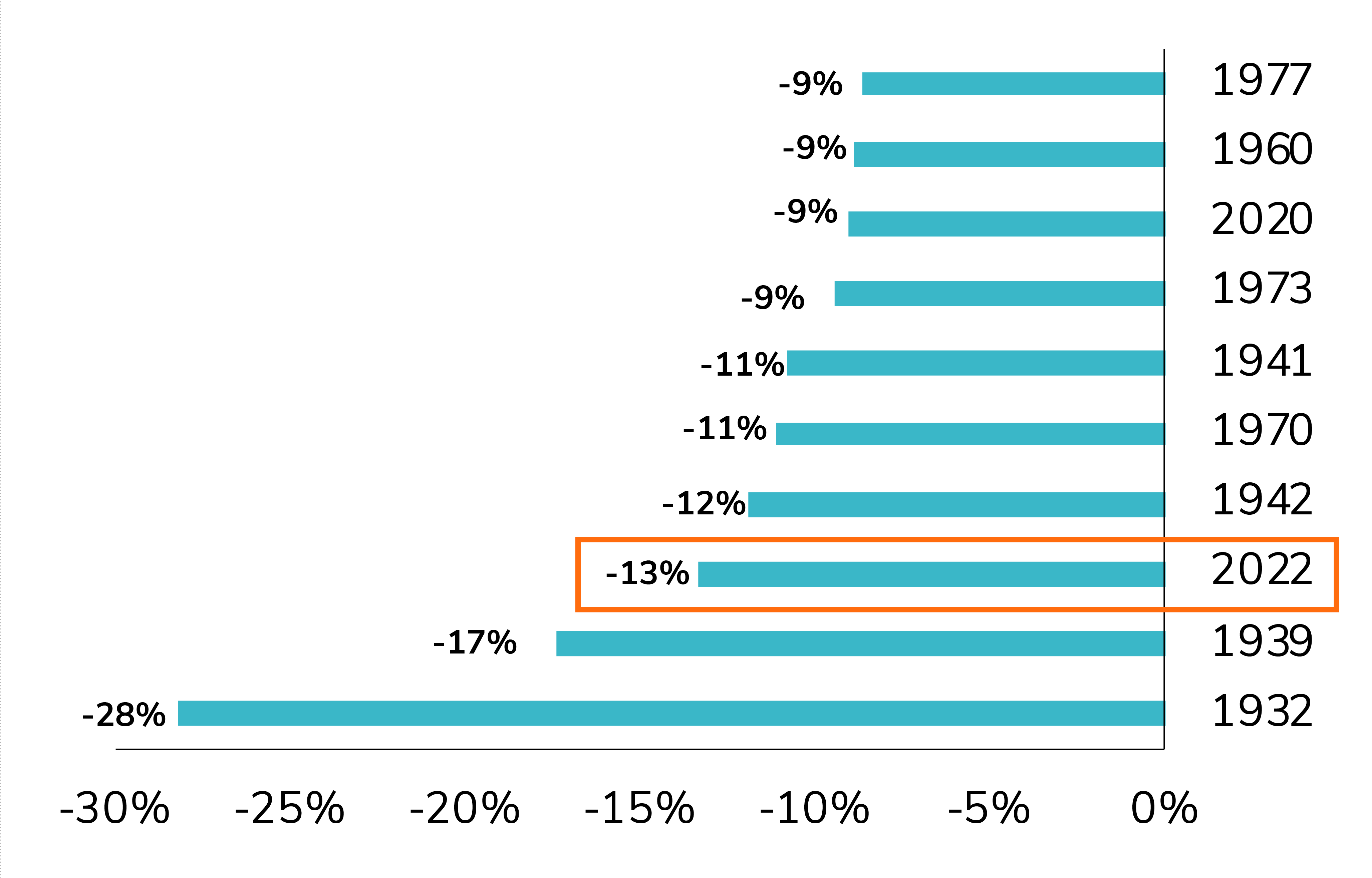 The stock market’s relative calm in the last half of March and early April was fleeting, as the last two weeks of the month produced a near 50% jump in the Cboe Volatility Index ꟷ also known as the VIX. The major US equity indices were all down for the month. The S&P 500 lost nearly 9% - its worst month since March 2020 during the Covid-19 crash. On a year-to-date basis, the S&P 500 is down -13.3%, its 3rd worst start of a year ever (see chart below).