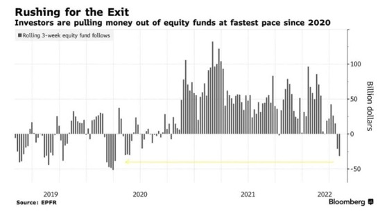 One of the surprising stories of the 1st quarter was the strong inflows into equity funds despite the negative headlines (war, inflation, monetary tightening, etc.). A plausible explanation was that investors were looking for shelter from the rise of inflation. But in a stark contrast from the first three months of 2022, equity funds suffered outflows in April for three straight weeks, the longest streak of withdrawals since August 2020, data compiled by EPFR Global show (see chart below).