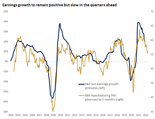 Corporate America is another shock absorber. Corporate balance sheets are in decent shape and S&P 500 earnings growth has been revised upward since the start of the month. 2023 earnings growth prospects look much more challenging but so far, the current equity bear market has been driven by a liquidity squeeze (i.e Fed tightening weighing on valuations) rather than a profit recession.