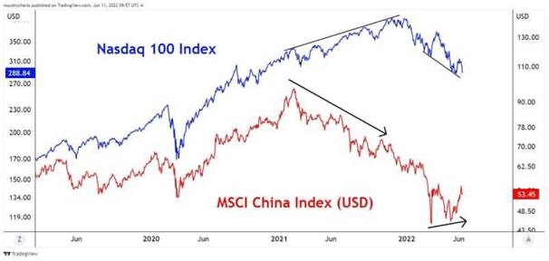 As shown on the chart below, China stock index has been diverging from the Nasdaq trend. Among the triggers for the recent outperformance: