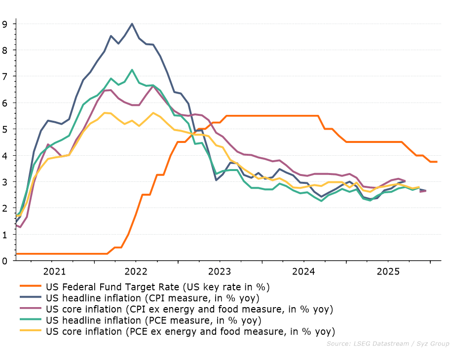 Chart 1: The Fed keeps the key rate unchanged as inflation remains above the 2% target and unemployment low at 4.4%