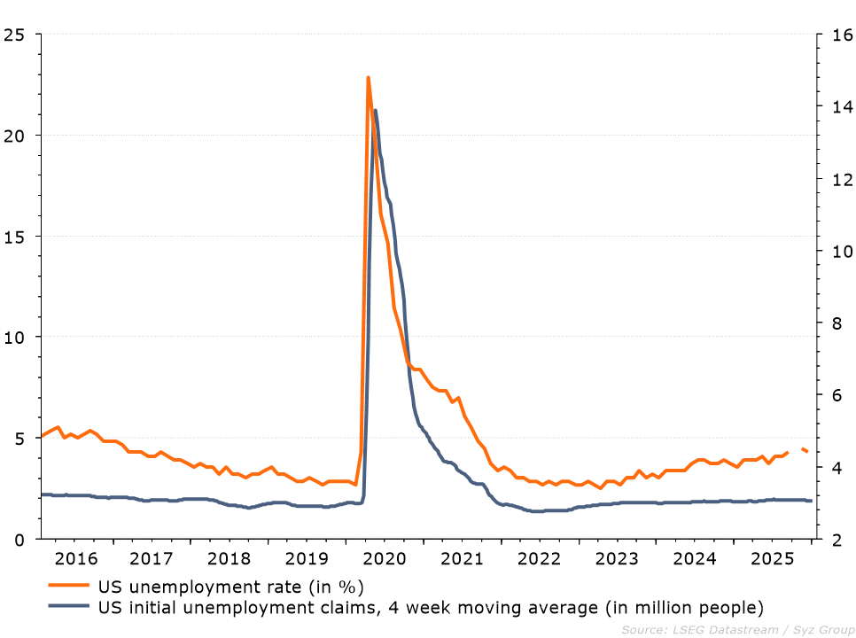 Chart 2: Unemployment rate declined back to 4.4% and initial unemployment claims monthly average also grinded lower in the last weeks