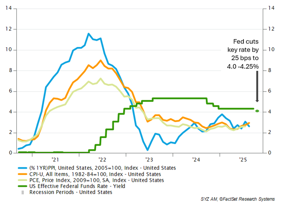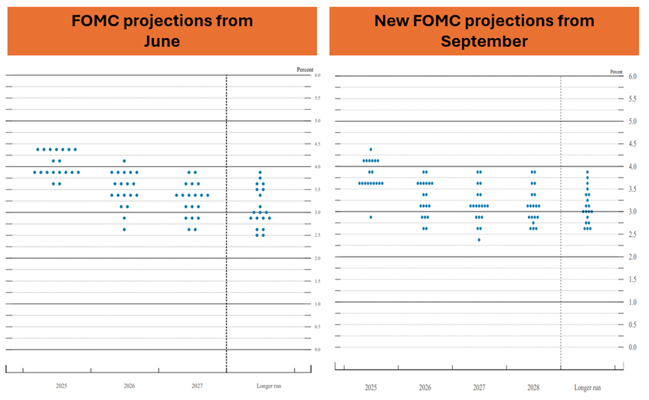- The Fed conducted its first rate cut since the end of last year and lowered the key rate from 4.25-4.5% down to 4.0-4.25%. Surprisingly, there was a stronger than expected consent with only new Fed governor Miran, a President Trump nominee, dissented for a larger, half percentage cut.