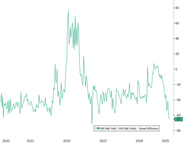Credit markets rebounded last week, but beneath the surface, the divergence between U.S. and European markets continued to widen. In the U.S., investment-grade spreads tightened, yet dispersion across sectors increased—especially among industries most exposed to rising tariff threats. The geopolitical backdrop remains tense: China announced a halt to Boeing purchases, while Russia floated the idea of using sanctioned assets to buy U.S. aircraft. At the same time, early data suggest foreign investors have begun to trim their exposure to U.S. corporate bonds, a shift from the steady inflows of recent years, adding further pressure to the credit space. In contrast, the European credit market benefited from a relatively calmer inflation backdrop and more dovish monetary policy signals. The ECB’s flexibility to ease further, combined with the negative correlation between rates and spreads, helped cushion European credit from the worst of recent market volatility. Credit in the euro area appears better positioned for now, with less direct impact from U.S.-China trade tensions. Despite these diverging dynamics, both markets participated in a relief rally. U.S. investment-grade spreads narrowed by 7 basis points to 111bps, and the Vanguard USD Corporate Bond ETF bounced back with a 2.0% weekly gain, recovering from the prior week’s loss and returning to positive territory for the year at +1.0%. European IG spreads compressed in parallel by 8 basis points to also settle at 111bps, with the iShares Euro IG ETF up 1.1% last week, bringing its year-to-date performance to +0.8%. High yield markets also rallied. In the U.S., HY spreads tightened by 24bps to 402bps, while the iShares USD HY ETF gained 1.5% over the week, stabilizing its YTD performance. European HY spreads followed closely, tightening by 25bps to 387bps, and the iShares Euro HY ETF advanced by 1.7%, lifting its YTD return to +0.3%. The high-beta segments saw strong follow-through, with European corporate hybrids rising by 1.5%, building on their previous week’s gain and now showing a modest 0.4% year-to-date return. Meanwhile, the WisdomTree AT1 CoCo ETF rose by 2.0%, nearly erasing prior losses and bringing YTD performance back to -0.1%. While the rally offered some short-term relief, the broader environment remains volatile. Heightened uncertainty around global trade policies, central bank decisions, and geopolitical risks will likely keep credit markets—particularly those tied to global supply chains or foreign capital flows—under pressure in the weeks ahead.