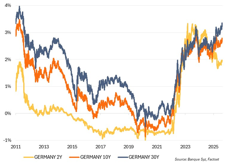 USD rates ended up the week mostly higher following the release of PPI inflation data, as investors are still torn between concerns of slowing economic growth and fears of inflation resilience (or even inflation resurgence). Uncertainties surrounding the Fed’s next Chair, divisions within the FOMC in the context of repeated and significant political pressures for lowering rates also contribute to oscillations in USD rates, without any clear direction for the time being. US treasury 10-year yields have evolved in a 4.2%/4.5% range for most of the past 6 months.