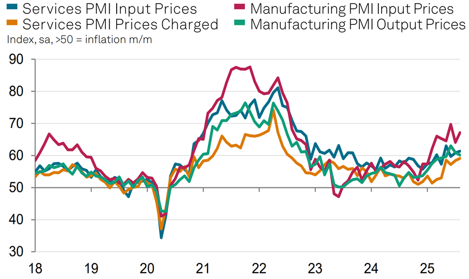 Chart 1: Input and output indicators of the latest PMI readings clearly point to further price pressures in both, manufacturing and services sector