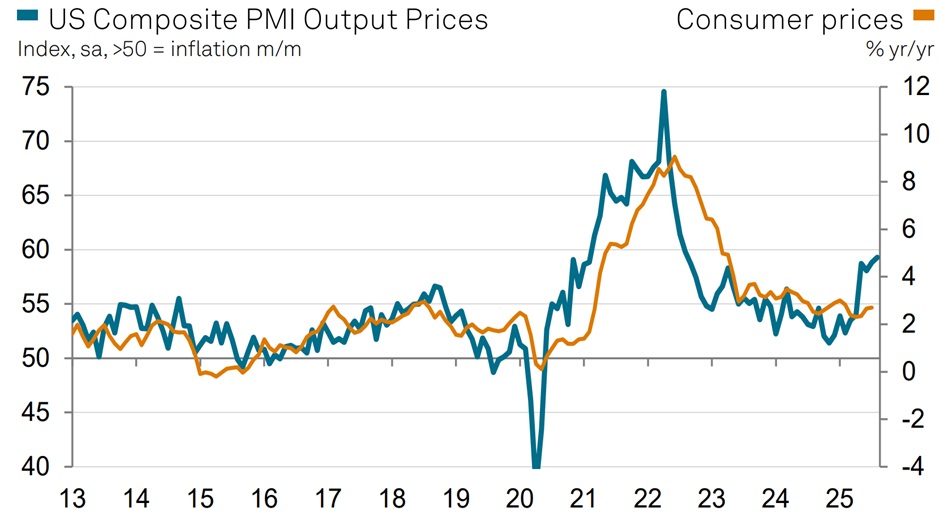 Chart 2: A simple comparison of the PMI output price index and the US inflation CPI index points to higher CPI readings