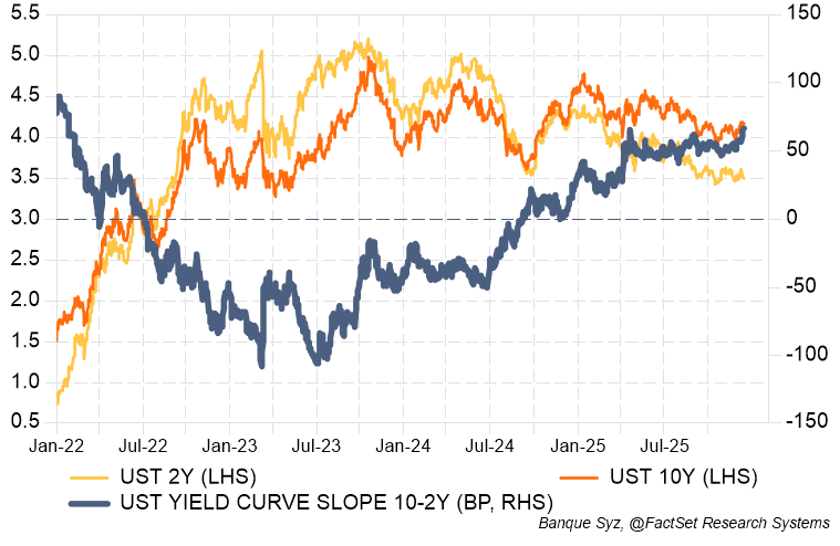 Government bond markets experienced a pronounced curve steepening over the week, driven primarily by developments in US monetary policy after the Fed’s rate cut and raising uncertainties around the medium-term inflation outlook.