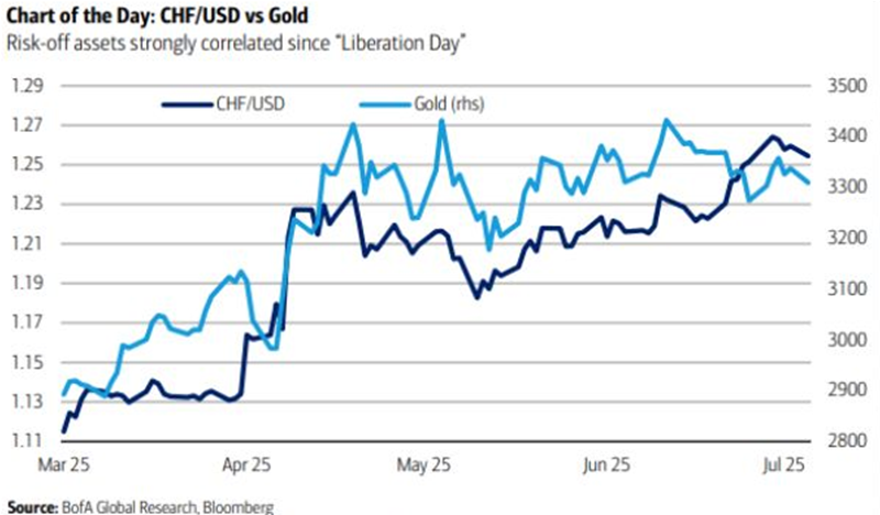 BofA contends that the CHF is now acting more like gold: a liquid, neutral hedge against long-term fiscal uncertainty in a world with few G10 alternatives, rather than a response to short-term market stress.