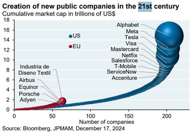 New public company formations in the 21st century, with EU firms shown in red and U.S. firms in blue. Bubble size represents market capitalisation as of December 31, 2024.