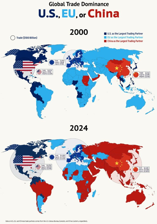 China’s total trade value jumped from $474 billion in 2000 to $6.2 trillion in 2024, placing it ahead of both the US and the EU as the world’s largest trading power.