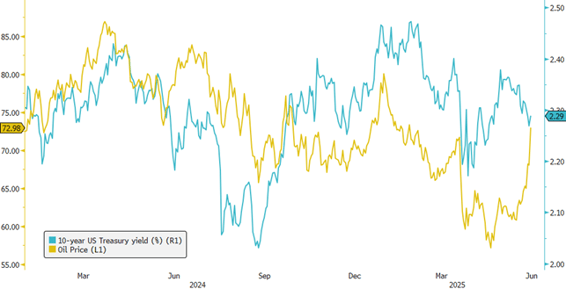 Federal Reserve officials remain in a self-imposed blackout ahead of Wednesday’s FOMC, which is expected to result in a hold. May’s CPI and PPI data arrived below forecasts, with inflation expectations softening—signaling that tariff effects have not yet permeated prices. However, the 13% weekly jump in Brent oil prices, triggered by renewed conflict between Israel and Iran, threatens to generate upward pressure on headline inflation and wage expectations. The Fed now faces twin supply-side shocks—tariffs and oil—that it cannot directly control. These complicate its disinflation path and highlight upside risks stemming from longer-lasting inflation expectations or second-round effects. The key questions this week: will policymakers adjust their dot plots to reflect remaining inflation risks? Or will they hold steady, confident that the core outlook remains stable? Over in Europe, the ECB finds itself similarly constrained. After eight rate cuts this cycle, only one more 25bp cut is priced in. But with oil moving sharply higher and the euro fluctuating, the central bank’s decision-making has grown more perilous. The upcoming policy meetings from the SNB, BoE, Norges Bank, Riksbank, and BoJ are unlikely to depart materially from their current cautious stance. Globally, central bankers are navigating an environment of significant uncertainty—where neither trade nor energy developments can be reliably forecasted.