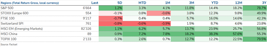 In Europe, markets were broadly flat, while the UK was down 1.4%. Elsewhere, emerging-market technology stocks outperformed, up 3.2%, led by names such as Nu Holdings and MercadoLibre, which rallied alongside Chinese technology stocks (+2.7%). Year-to-date, Chinese internet stocks (KWEB) are up 42% in USD terms, far outpacing the Nasdaq Composite (+17%). However, concerns are building around the domestic rally, with stretched valuations, narrow breadth, and elevated margin financing activity. From a country standpoint, Brazil was among the best performers in EM, up 3.1% on the week thanks to stable domestic rates and lower inflation forecasts. On the other hand, Japan slipped 0.5% after the Bank of Japan unveiled plans to unwind $250bn of ETFs and REITs — an exit long anticipated but announced much earlier than markets expected.