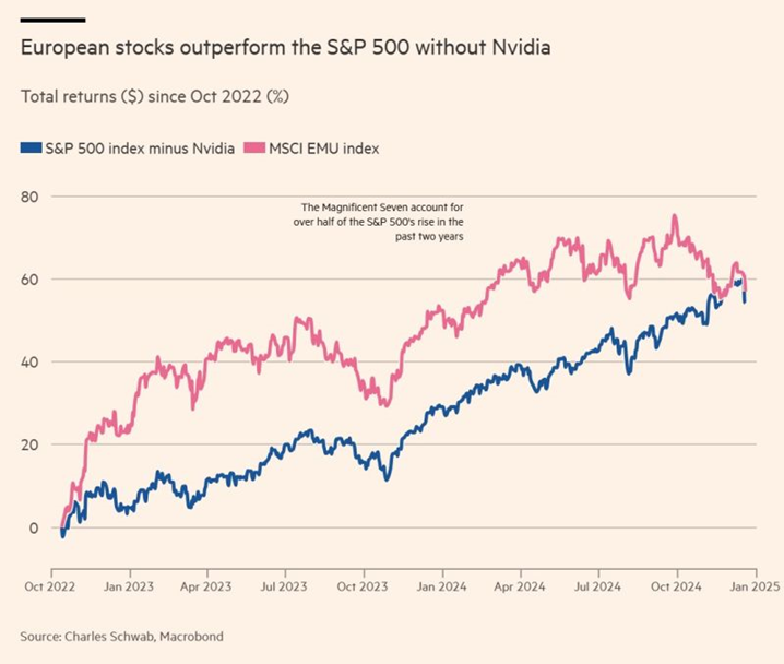 Without Nvidia's contribution to the S&P 500, the performance of the main benchmark since the start of the current bull market in October 2022 has underperformed that of the Eurozone equity benchmark.