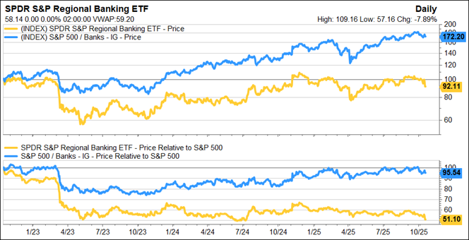 The large bank index has largely recovered from the April 2023 Silicon Valley Bank event, while regional banks have not: