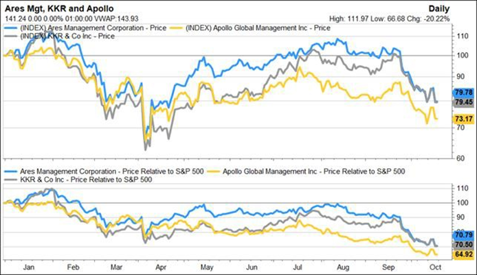 Companies such as Apollo, KKR, and Ares have significant exposure to the private credit market, with the first two having well over 50% of AUM in that segment and KKR around 40%. While these firms have reported solid earnings so far, investors have become increasingly cautious about the associated risks. Share price performance reflects these concerns, as these companies have underperformed this year, following a strong run in 2024 ahead of the US presidential election.