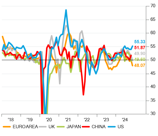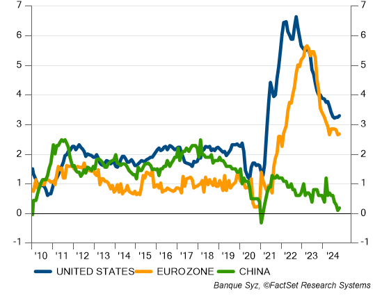 The global economic cycle is therefore clearly desynchronising in the late part of 2024. The US economy continues to defy expectations of any form of slowdown and will benefit from a pro-growth policy mix in 2025. The fears of a “hard landing” have been dismissed, and even expectations of a “soft landing” are now challenged by the resilience of the activity and the pickup in inflation dynamics. On the contrary, Europe and China have been through a clear slowdown in activity in the middle of 2024. But only China has so far been able to react with a policy package designed to trigger a pickup in activity. Europe remains stuck on a worrying downward trend, plagued by an accumulation of headwinds and by political paralysis in the two largest economies of the continent.
