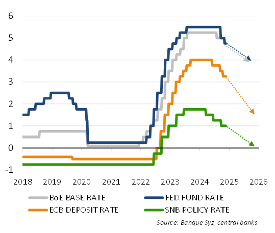 Diverging growth and inflation dynamics naturally result in varied monetary policy approaches. Following the synchronized global rate hikes of 2022–23, the anticipated rate cut cycle of 2024 is already proving far less aligned. All major central banks have cut interest rates this year, following the easing in inflationary pressures from their peak. But in these last months of 2024, rate cut expectations are being adjusted in response to differing growth and inflation developments. In the Eurozone, weak activity and slowing inflation warrant the ECB to forcefully cut rates to bring the monetary policy stance toward a neutral (or possibly accommodative) stance. In Switzerland, slowing inflation and upward pressures on the CHF require the SNB to lower rates back toward zero. In contrast, in the US and in the UK, the combination of persisting inflation and prospects of fiscal stimulus next year clearly reduces the need for adjusting monetary policy. As investors look toward 2025, they now expect that the Fed and the BoE will not have to cut significantly their key rate in the coming months.
