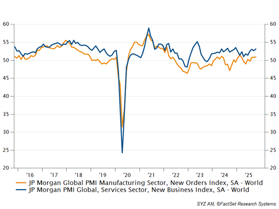 Chart 1: Global service sector business activity’s leading indicator stays strong, and the manufacturing sector did improve lately to positive levels too