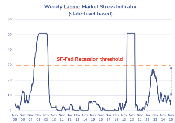 Another source of stress for investors has been the US job market. Ahead of the shutdown, public data pointed towards weakening job growth. Over the last weeks, alternative and private data showed mixed signals. While the employment report showed job gains well above expectations, the Challenger, Gray & Christmas report painted a more negative picture, revealing a sharper-than-expected increase in announced job cuts, suggesting layoffs are rising even as hiring remains strong. We believe the shutdown introduces tangible biases to the data. To our view, overall indicators for the US labour market do not currently suggest significant stressor an impending new recession.